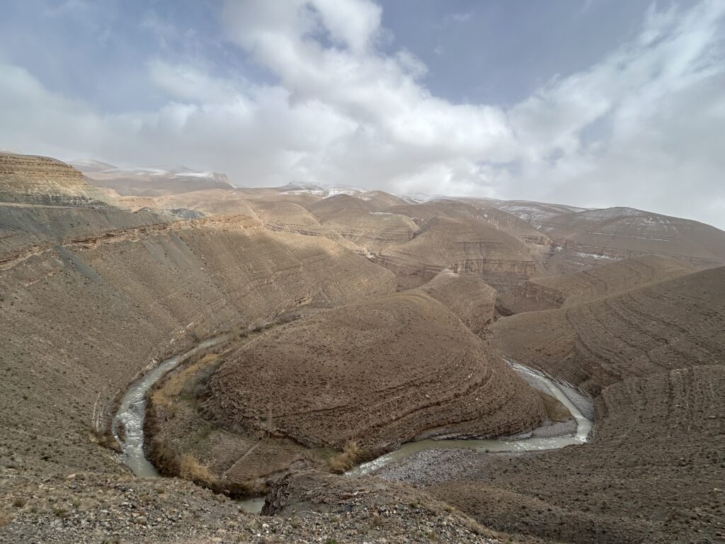 Von Merzouga aus wählten wir eine tolle Sandpiste nach N‘Kob am Fusse des Jebel Sarhro. Da es auch in dieser Wüstenlandschaft viel Niederschlag gab, rieten uns die Einheimischen, möglichst nördlich zu fahren, da ansonsten kein Durchkommen über den immer noch matschigen feuchten Abschnitt in der Nähe des Flusses sei. Zwei Tage waren wir alleine auf weiter Flur. Kamele begleiteten uns zeitweise, weideten im grünen Gras samt Blumenpracht und dies inmitten dieser kargen Landschaft. Wir konnten uns nicht sattsehen über die vielen Kontraste in dieser fantastischen und manchmal fast unwirklichen Gegend. Und dann trafen wir bei Ali und seiner Familie auf ihrem kleinen liebevoll gestalteten Camping in N’Kob ein. Da das Wetter wieder „up and down“ spielen wollte, legten wir an diesem wunderschönen Ort erstmals eine Verschnaufpause ein und genossen ihre grosse Gastfreundschaft. Sternförmig konnten wir hier Wandern und Biken und im Dorf die über 40 Kasbahs, welche teils renoviert sind, erkunden. Mit Kasbah bezeichnet man Festungen und Wohnburgen aus Lehm, welche Ende des 19. / Anfang des 20. Jahrhunderts von berberischen Stammesführer errichtet wurden und zum Schutz vor Angriffen sowie als Verwaltungszentren dienten. Viele sind leider verfallen, doch einige konnten gerettet werden und dienen heute oftmals als einfache Gasthäuser und sind nach wie vor in Privatbesitz. Von N‘Kob aus drehten wir eine viertägige Runde über den Tizi n‘Tazazert Pass ins Rosental weiter über eine einsamste Piste in die Gorges du Dadès und Gorges du Todra und wieder zurück über abgeschiedenen Pisten am eindrucksvollsten Gebierge des Jebel Sarhro entlang zu Ali. Kein Wunder nennt Ali seinen Platz „Land of Dreams“, denn auch für uns wurde sein Platz etwas Besonderes. Wir genossen die interessanten Gespräche über Marokkos Alltag und seinen Herausforderungen. Ihre Bescheidenheit und zugleich grosse Dankbarkeit an einem für sie schönsten Ort der Welt leben zu dürfen ist gross und beeindruckte uns sehr. Das einfache Berber-Essen im Kreise der liebevollen Familie war neben diesem schönen Platz auch ein Traum für Sinne und Herz, welches wir mitnehmen dürfen für unsere Weiterreise in den Süden und für unser Leben.